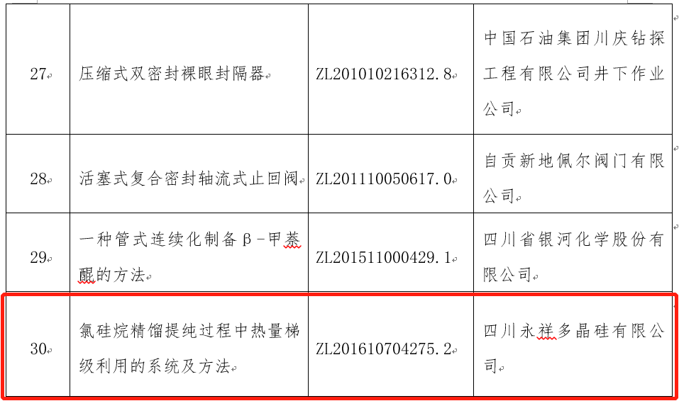 近日,四川省知識產(chǎn)權(quán)服務(wù)促進中心發(fā)布了2019年度四川省專利獎評審公告,四川永祥多晶硅有限公司發(fā)明專利“氯硅烷精餾提純過程中熱量梯級利用的系統(tǒng)及方法”榮獲本次四川省專利獎創(chuàng)新創(chuàng)業(yè)獎。