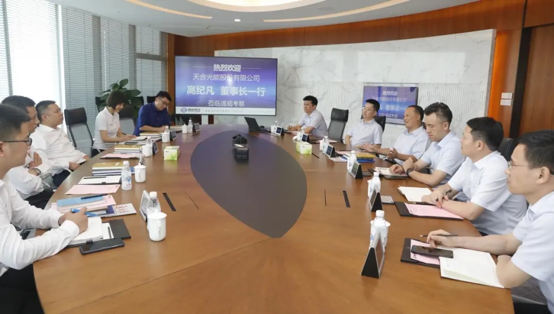 7月14日—15日,隆基綠能董事長鐘寶申、陽光電源董事長曹仁賢、天合光能董事長高紀凡、遠景能源董事長張雷一行蒞臨通威考察。十一屆全國政協常委、全國人大代表、通威集團董事局劉漢元主席熱情接待,通威股份董事長謝毅,通威股份董事、永祥股份董事長兼總經理段雍陪同接待。