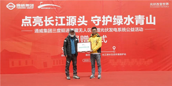 為推動長江源生態環境保護,通威集團于2018、2019年先后向青藏綠色驛站和班德湖野生動物觀測站捐贈離網光伏發電系統,開創了世界屋脊光伏電站捐贈先河,2020年,通威集團第三次挺進青藏無人區捐建30KW離網光伏發電系統,向長江源水生態環境保護站及其附屬的驛站輸送清潔電能,為長江源生態環境的保護持續貢獻力量。6月5日,世界環境日,“點亮長江源頭 守護青山綠水”——通威集團長江源水生態環境保護站公益捐贈儀式在長江源水生態保護站成功舉行。綠色江河環保促進會會長楊欣、通威集團品牌管理中心主任助理康煜以及來自通威集團、綠色江河環保促進會的志愿者們共同見證了這一歷史時刻。