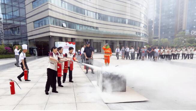 下午16:20演練正式開始,現(xiàn)場(chǎng)人員發(fā)現(xiàn)火情,按下消防手報(bào),消防控中心聯(lián)系就近巡邏確認(rèn)火情后,迅速通知滅火組趕赴現(xiàn)場(chǎng)。滅火組達(dá)到事故地點(diǎn)用滅火器撲救,發(fā)現(xiàn)火情無法控制,立即上報(bào),消防疏散預(yù)案隨即啟動(dòng)。消防控制中心向當(dāng)?shù)叵啦块T電話報(bào)警,同時(shí)通知各應(yīng)急小組進(jìn)入作戰(zhàn)狀態(tài)。警戒組迅速到達(dá)事故點(diǎn),避免無關(guān)人員進(jìn)入,指引消防車輛進(jìn)入;設(shè)備保障組現(xiàn)場(chǎng)保障消防設(shè)備設(shè)施正常運(yùn)行并切斷水電氣;疏散組迅速組織各樓層人員撤離;后勤保障組搜尋傷員并安全運(yùn)出。所有人員在10分鐘內(nèi)全部撤離至指定集結(jié)點(diǎn)。隨后,參演人員接受了現(xiàn)場(chǎng)消防知識(shí)講解,并實(shí)際操練了干粉滅火器撲滅油盆起火、消火栓操作等消防技能。