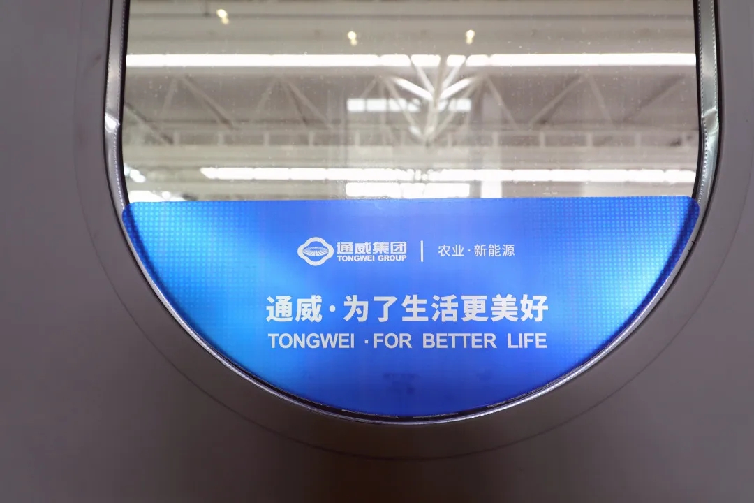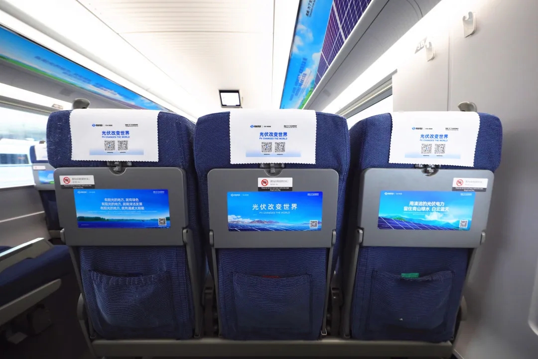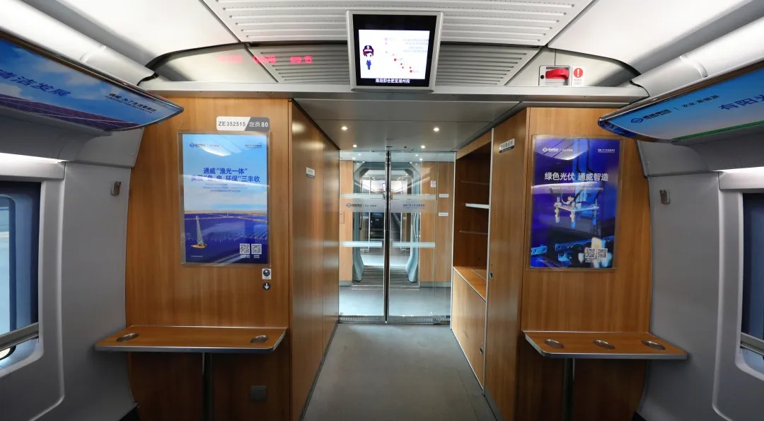 在儀式現場,“通威號”高鐵專列整裝待發。車廂內外,“通威 為了生活更美好”的企業標識貫穿全車,車廂內展示了通威新能源產業發展成果以及綠色發展理念。