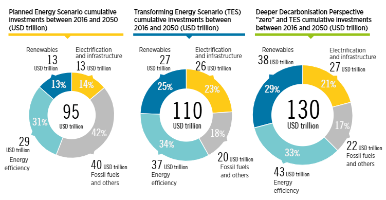 為了確保氣候安全,需要擴大對清潔能源技術的投資并轉變投資方向。需要將化石燃料投資轉向可再生能源和能效,逐步取消化石燃料補貼。到2050年,“轉型能源情景”中能源系統總投資需要達到110萬億美元,約占同期年均GDP的2%。其中,超過80%的資金應投資可再生能源、能效、終端用能電氣化以及電網和靈活性。如果以年度計算,每年的投資水平應達到約3.2萬億美元。相比之下,2014-2018年期間平均每年的投資約為1.8萬億美元,而在“已規劃能源情景”下未來將達到2.9萬億美元/年。如果希望實現“零碳排放”,到2050年對能源系統總投資需要達到130萬億美元。