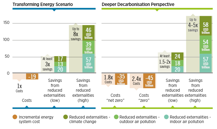加快可再生能源部署和提高能效回報將遠大于投入。按照“轉型能源情景”,能源轉型每花費1美元,將獲得3-8美元的投資回報。換言之,到2050年 “轉型能源情景”將增加19萬億美元的成本,但通過降低環境和健康損害,將獲得50-142萬億美元的回報。要實現凈零排放,“更深度脫碳情景”將需再增加16萬億美元投入,如果實現完全無排放則將增加26萬億美元成本,但零碳排放帶來的收益將達到62-169萬億美元。另一種衡量成本的方法是在此期間減少一噸碳排放的成本。對于“轉型能源情景”,該成本為34美元/噸,對于“更深度脫碳情景”凈零排放,成本為100美元/噸,對于“更深度脫碳情景”完全零排放,成本為156美元/噸。