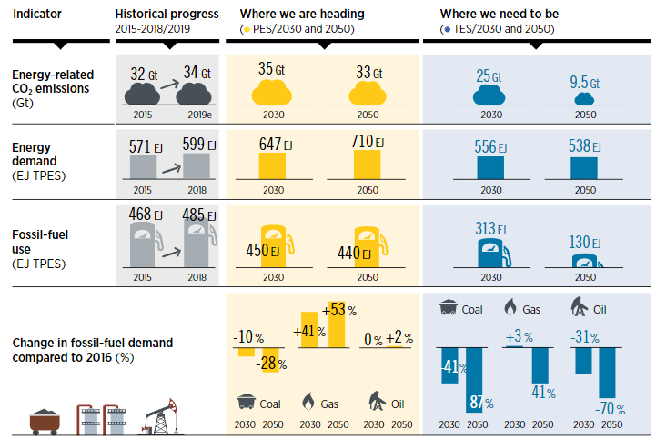 到2050年全球一次能源需求、化石燃料需求以及能源相關碳排放變化