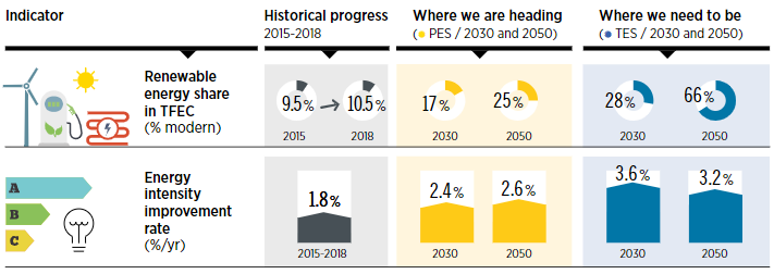 作為降低碳排放的主要解決方案,能效和可再生能源需加速部署。能效和可再生能源是實現全球能源轉型的兩個關鍵解決方案。然而,由于能源需求持續增長,2010年以來可再生能源在全球終端能源消費中所占的份額僅在10%左右緩慢增長。2019年能源強度僅增長1.2%,低于過去十年的平均水平(1.8%)。按照“轉型能源情景”,可再生能源、能效和電氣化將共同貢獻90%的能源相關減排量,可再生能源在終端能源消費占比到2030年應增至28%,到2050年需達到66%,而能源強度改善速度需提高到每年3.2%,才能滿足全球氣候目標。