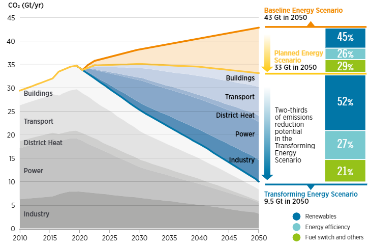 世界迫切需要清潔、可持續的能源解決方案以加速碳減排步伐。近年來能源發展趨勢表明了加速碳減排的必要性。盡管近年來可再生能源在能源結構中的份額、能源強度以及終端用能電氣化程度都有所改善,但發展速度難以滿足全球氣候目標需求。根據當前各國制定的政策承諾及目標,到2050年全球一次能源需求將從目前的600 EJ增長至710 EJ,化石燃料消費量仍與當前持平,因此將無法滿足全球碳減排目標。IRENA的“轉型能源情景”和“更深度脫碳情景”提供了全球經濟長期穩定以及低碳安全發展的基礎。根據“轉型能源情景”,到2050年全球化石能源消費將下降75%,能源相關碳排放將以年均3.8%的速度下降至約100億噸,比當前水平降低70%,使全球平均氣溫上升2℃以內;而“更深度脫碳情景”則有望到2050年實現凈零排放(最遲到2060年前實現),并使全球溫升控制在1.5℃以內。