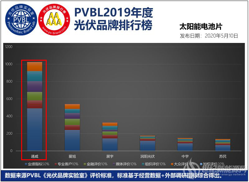 通威太陽能榮登“PVBL2019光伏品牌排行榜”電池片排行榜榜首 “PVBL中國光伏品牌排行榜”創建于2012年,是中國唯一一個以評價光伏品牌價值的調研排名榜單,被譽為“中國光伏市場晴雨表”。榜單優先考察參評品牌(企業)的年度出貨、營收、科研、影響、服務5個一級指標,同時綜合測評品牌知名度、品牌美譽度、品牌忠誠度、社會責任、行業影響、社會影響等10個二級指標。榜單已連續發布七屆,在業內具有極高的權威性和公信力。 PVBL2019年度光伏品牌價值排行榜(總榜) 此次“PVBL2019光伏品牌排行榜”電池片排行榜,通威太陽能從業績指標、專業客戶、金融評價、媒體評價等評分指標遠超榜單第二名企業近乎一倍,這不僅展示了通威太陽能過硬的整體實力,更是社會各界對通威品牌的信任,也是對通威太陽能產品品質和服務品質的高度認可與肯定。此前,光伏產業權威分析機構PV InfoLink公布的2019年電池片出貨排名中,通威太陽能以單晶PERC電池片年出貨量超過10GW的總出貨量遙遙領先其他廠家,穩居第一的寶座,這也是通威太陽能自2017年首次榮登該電池片出貨量榜首以來的3年連冠。 PVBL2019年度光伏品牌排行榜(太陽能電池片) 自成立以來,通威太陽能持續加強在電池片環節的研發、制造與推廣,不斷刷新光伏行業新紀錄,受到了行業內外的高度關注和廣泛贊譽,先后斬獲“第七屆中國綠效企業最佳典范獎”、“優秀太陽能電池供應商品牌知名度排行榜第一”、“光伏電池智能制造行業領跑者”、“中國好光伏民族品牌獎”、“維科杯·OFweek2019卓越光伏電池產品獎”等諸多行業重磅榮譽。后期,通威太陽能將以此榮登“PVBL2019光伏品牌排行榜”電池片排行榜榜首為契機,持續鞏固光伏行業龍頭地位,引領行業健康可持續發展。