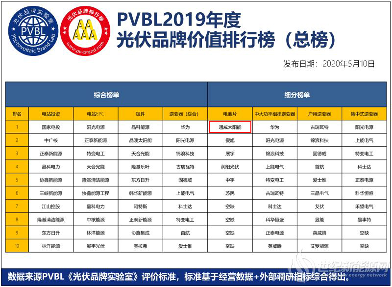 5月10日,第四個“中國品牌日”如約而至,由世紀新能源網、光伏品牌實驗室聯合主辦的第五屆世紀光伏大會隆重發布“PVBL2019光伏品牌排行榜”,通威太陽能作為光伏行業龍頭企業,強勢榮登“PVBL2019光伏品牌排行榜”電池片排行榜榜首。