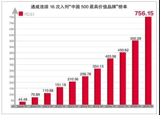 38年來,品質立企、品牌強企的品牌戰略始終伴隨通威發展,在通威集團董事局劉漢元主席的高度重視下,通威將品牌作為集團四大核心競爭力之一,以全球視野進行品牌戰略布局,不斷推動品牌建設全方位融入企業發展過程,通過持續性、系統性、創新性的全方位打造,品牌認知度和美譽度連年攀升。2019年通威集團以756.15億元再創品牌價值新高,連續16年入選中國500最具價值品牌榜。從2004年的19億元,到2019年突破756億元,通威品牌價值在短短16年里增長了近40倍,展示了全國乃至全球綠色農業和綠色能源龍頭企業和領軍品牌的雄厚實力。