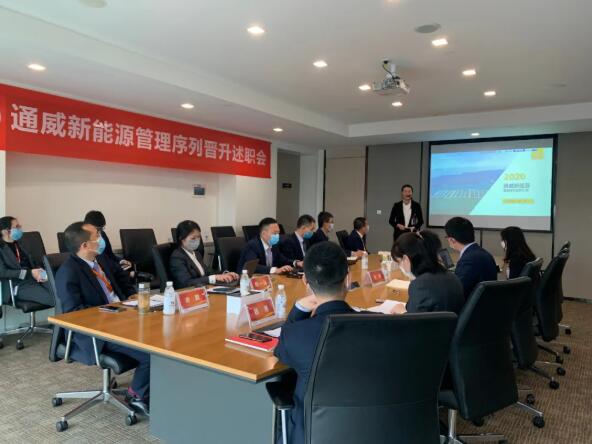 4月22日,通威新能源有限公司成功召開2020年度管理序列晉升評定會。通威新能源有限公司總經理助理冷剛、直屬業務副總經理楊勇及部門負責人代表出席會議現場并擔任評委,現場、線上員工代表參會。