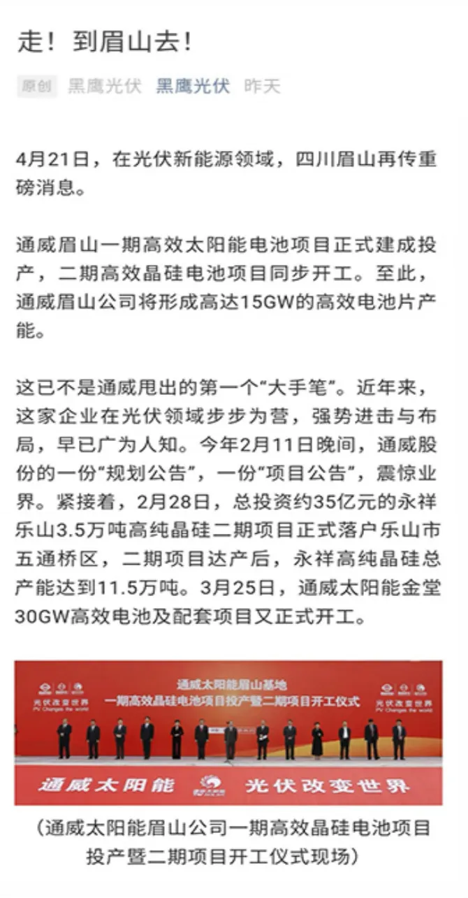 黑鷹光伏以“走!到眉山去!”為題解讀“通威速度”和“通威底氣”。報道指出,在助力治蜀興川同時,眉山項目的建成投產(chǎn),也將為通威在全球新能源最新競局中落下重筆。通威投資超百億的“眉山坐標”,無疑成為通威新能源大棋局中不可或缺的重要一環(huán)。