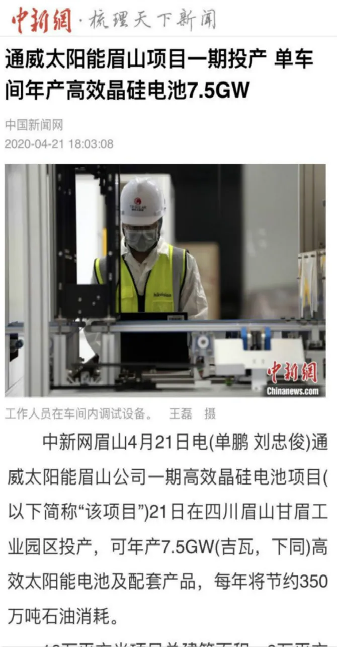 4月21日,作為央級權威媒體,中央廣電總臺國際在線、人民網(wǎng)、中新社紛紛推出報道,聚焦通威當天儀式。中央廣電總臺國際在線報道指出,通威太陽能眉山基地一期高效晶硅電池項目共有16條生產(chǎn)線,以高效電池無人智能制造路線為主,建設有智能化工廠、數(shù)字化車間、物流倉儲及相關配套設施,可年產(chǎn)7.5GW高效太陽能電池及配套產(chǎn)品。