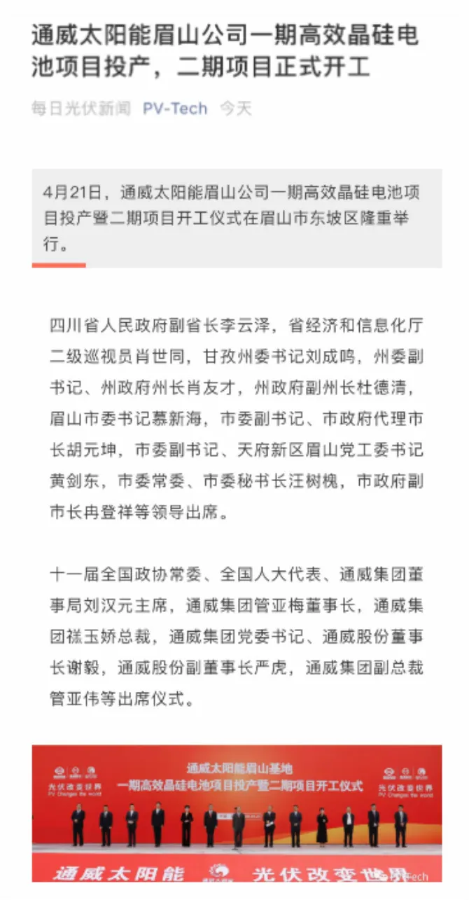4月22日,PV-Tech報道指出,自2015年11月落戶四川,通威已順利完成共5期電池項目建設,伴隨著眉山公司一期項目的投產(chǎn),全球晶硅電池單車間規(guī)模達7.5GW的世界記錄正式在眉山誕生。一期項目土建施工實際周期190天,再次刷新了通威速度。