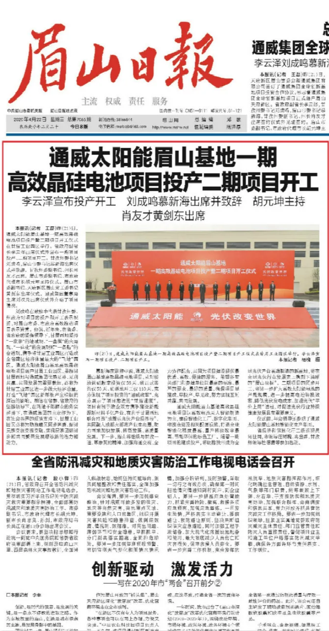 4月22日,《眉山日報》于頭版頭條位置深度解讀開工儀式現(xiàn)場情況及項目情況,并指出,通威太陽能眉山基地高效晶硅電池項目以高效電池無人智能制造為主,建設智能化工廠、數(shù)字化車間、物流倉儲及相關配套設施,打造全球智能化程度最高、量產(chǎn)轉換效率最高、節(jié)能環(huán)保的綠色工廠。