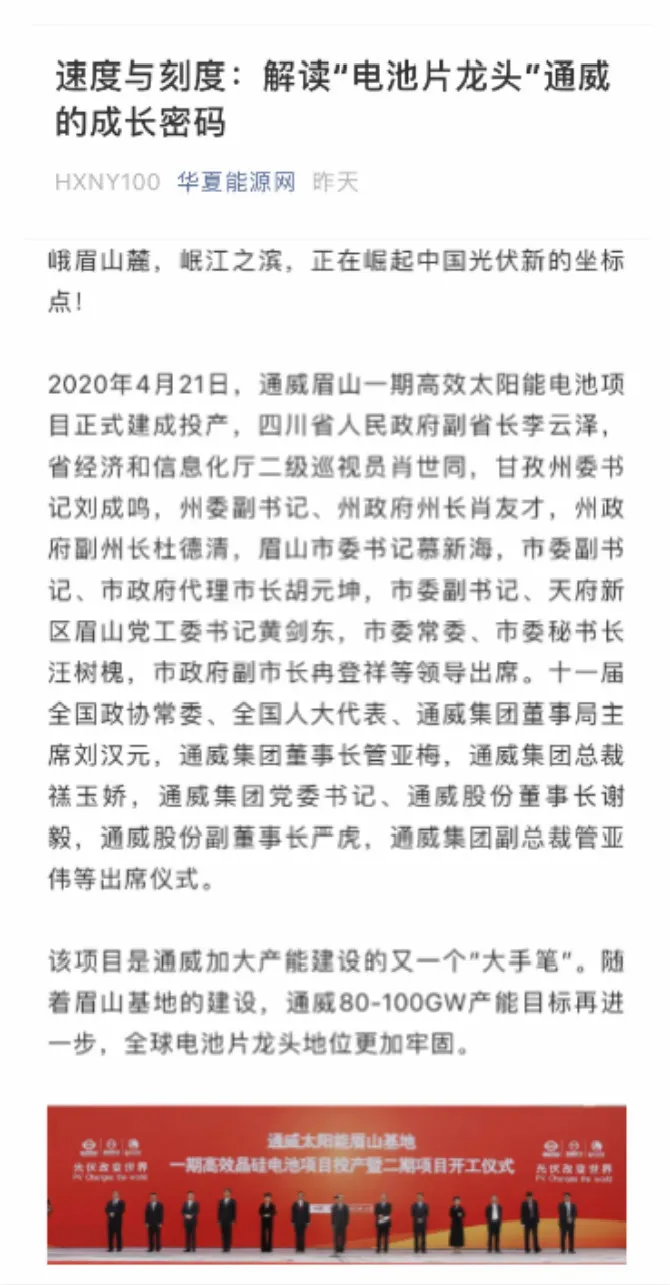 人民網(wǎng)、中新社深入解讀眉山項目助力地方經(jīng)濟發(fā)展,加速形成“成眉樂光伏產(chǎn)業(yè)經(jīng)濟帶”發(fā)展格局。報道指出,該項目從雙方開始接治到敲定投資僅用了36天,正式簽約僅用了50天,正式開工僅用了110天,從簽約到投產(chǎn),僅用了一年零三個月,創(chuàng)造了項目投資新的“通威速度”、“甘眉速度”、“中國速度”。