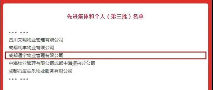 3月16日,成都市住房和城鄉(xiāng)建設(shè)局發(fā)布《關(guān)于表揚新冠肺炎疫情防控先進(jìn)集體和先進(jìn)個人(第三批)的通報》,公布成都市住房和城鄉(xiāng)建設(shè)局評選出的先進(jìn)集體和個人(第三批)名單,成都通宇物業(yè)管理有限公司榮膺“新冠肺炎疫情防控先進(jìn)集體”榮譽稱號。