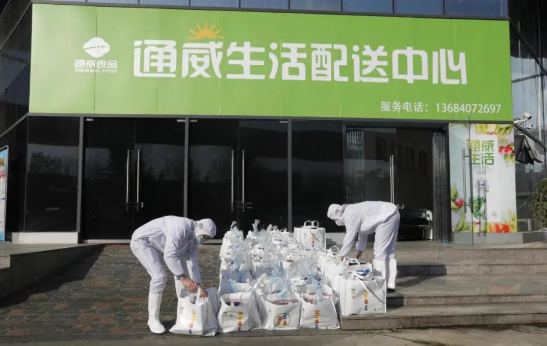 通威食品工作人員將禮包裝袋,準備為“白衣天使”送貨到家