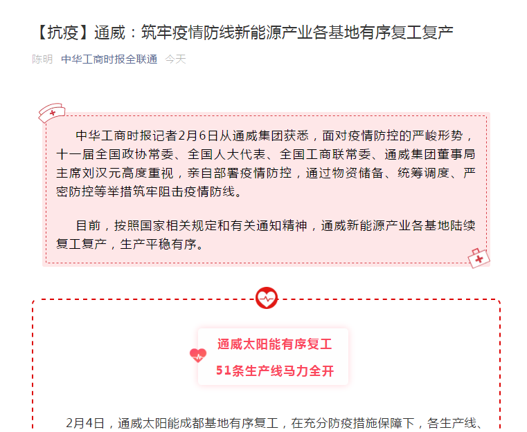 作為省內權威媒體,四川衛視此次報道是對通威全力戰“疫”、有序復工的高度認可,為省內其他企業組織復工生產樹立標桿。此外,全國工商聯機關報《中華工商時報》、全國知名財經類新聞媒體《時代周報》等主流媒體也對通威有序復工生產進行了聚焦報道。