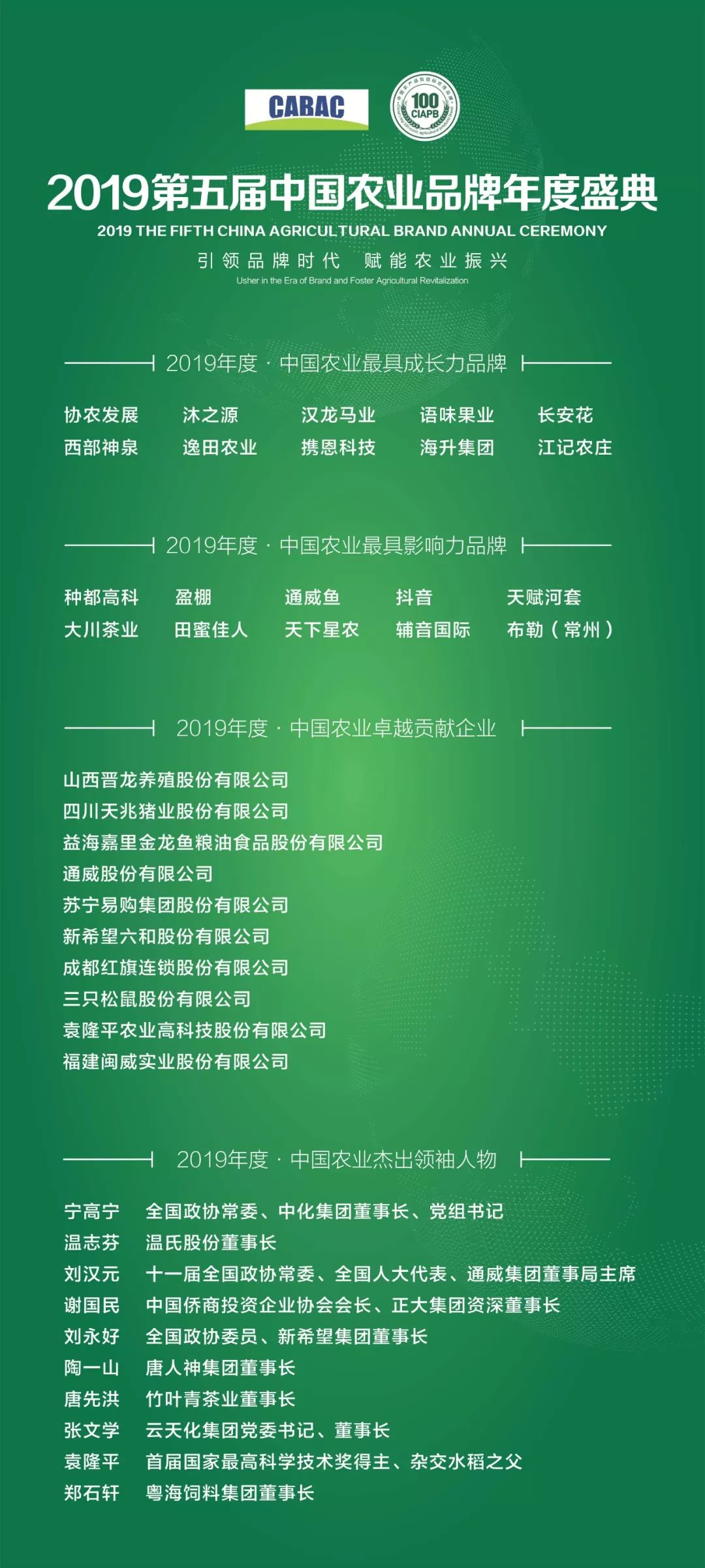 12月23日,2019第五屆中國農(nóng)業(yè)品牌年度盛典在成都通威國際中心隆重舉行。為樹立農(nóng)業(yè)品牌榜樣標(biāo)桿,傳遞中國農(nóng)業(yè)品牌正能量,大會重磅發(fā)布“中國農(nóng)產(chǎn)品百強標(biāo)志性品牌”名單,并隆重揭曉“2019年度·中國農(nóng)業(yè)最具成長力品牌”、“2019年度·中國農(nóng)業(yè)最具影響力品牌”、“2019年度·中國農(nóng)業(yè)卓越貢獻企業(yè)”、“2019年度·中國農(nóng)業(yè)杰出領(lǐng)袖人物”重磅大獎。