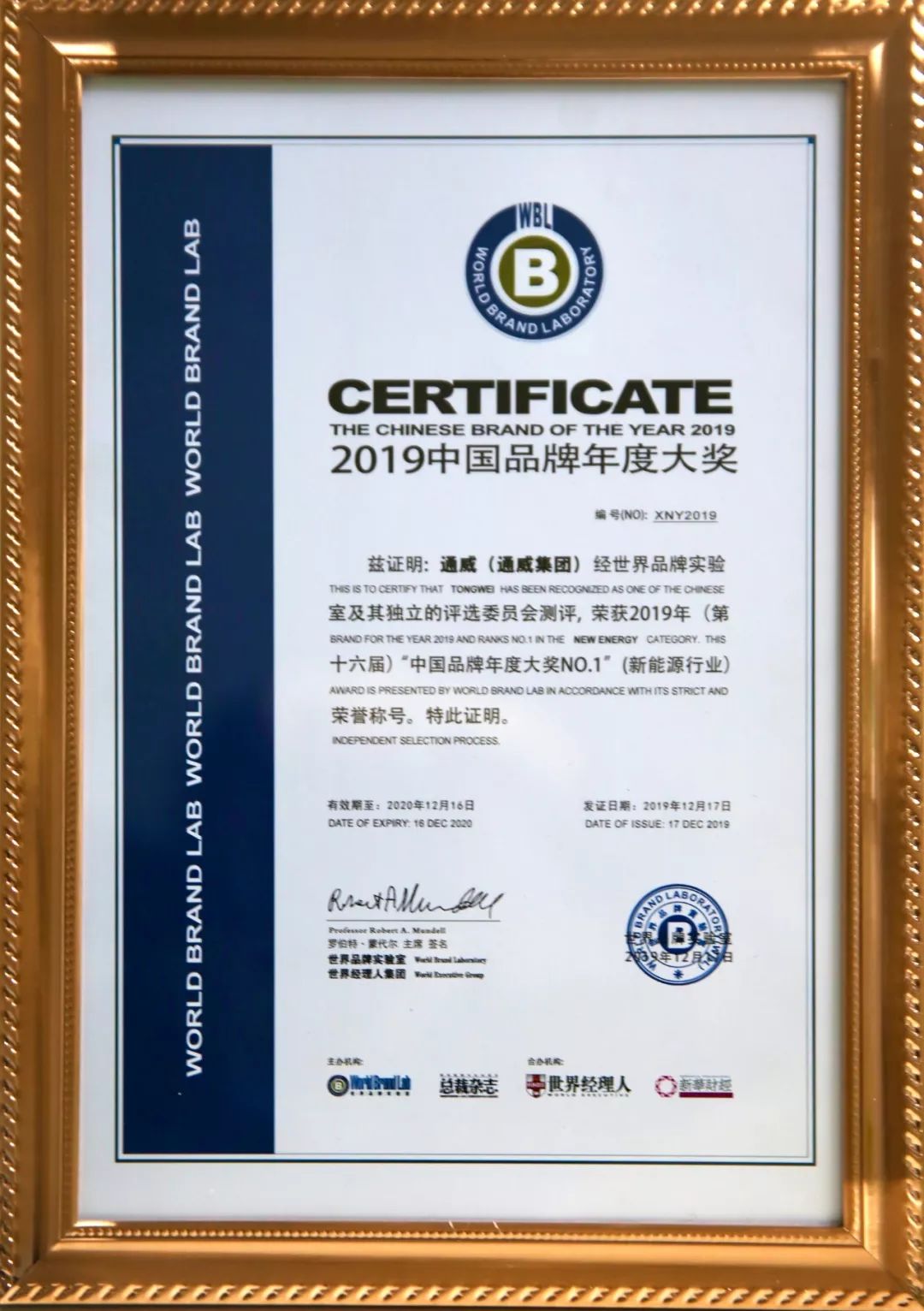 12月17日,被譽為“中國品牌奧斯卡”的2019中國品牌年度大獎頒獎盛典在京隆重召開,本次盛會由世界經理人雜志和世界品牌實驗室主辦,華為等35個活躍在2019年度中國經濟舞臺的領軍品牌入選“2019中國品牌年度大獎”。憑借新能源產業的穩健快速發展,通威集團榮獲2019“中國品牌年度大獎NO.1” (新能源行業),歐洲工商管理學院學術院長、首席教授齊夫·卡門博士(Ziv Carmon)、哥倫比亞大學商學院教授和管理系主任亞當·格林斯基(Adam Galinsky)出席會議并為獲獎品牌頒獎。