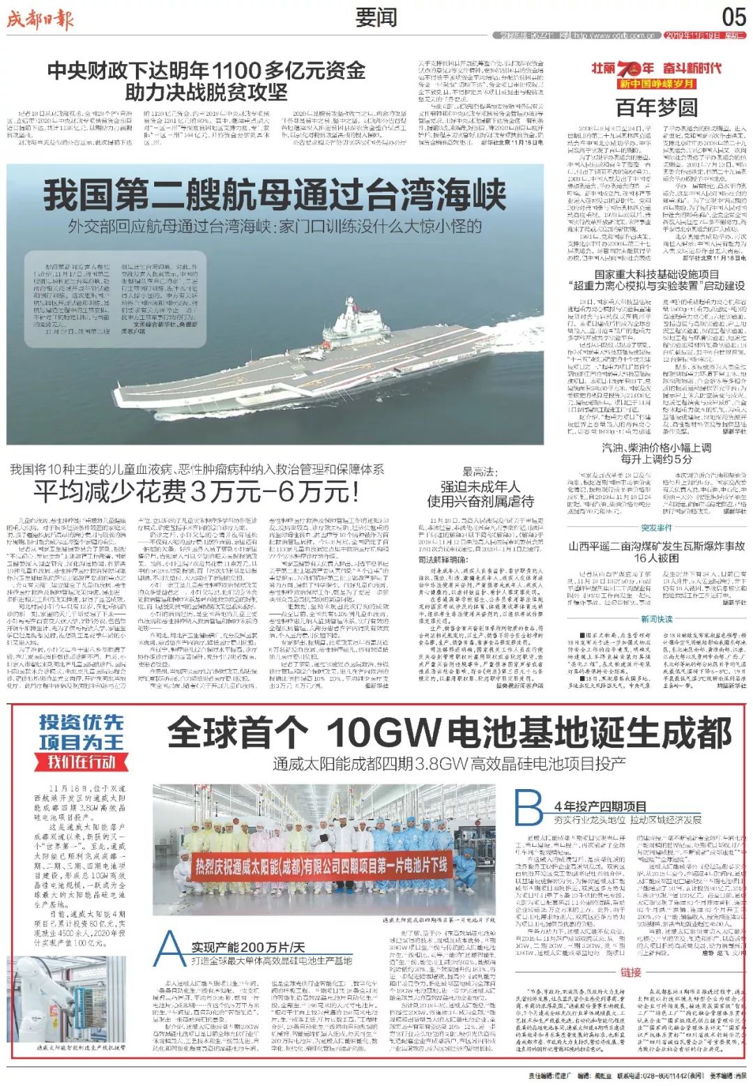 四川日報頭版以《通威太陽能刷新全球單車間產能規模紀錄》為題,深度聚焦通威太陽能四期項目整體規模、智能制造,以及未來規劃等情況,贊揚了通威太陽能不斷刷新全球單車間產能規模紀錄,助推區域經濟增長。報道指出,通威太陽能已順利完成成都一期、二期、三期、四期電池項目建設,4期項目累計投資80億元,實現就業4500余人,2020年預計實現產值100億元。