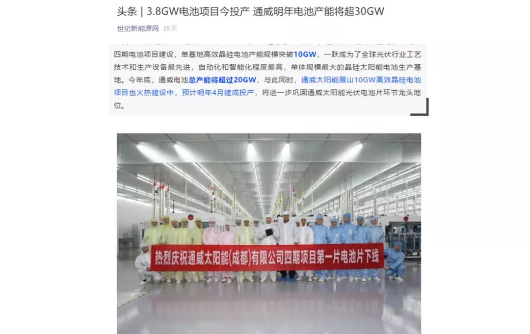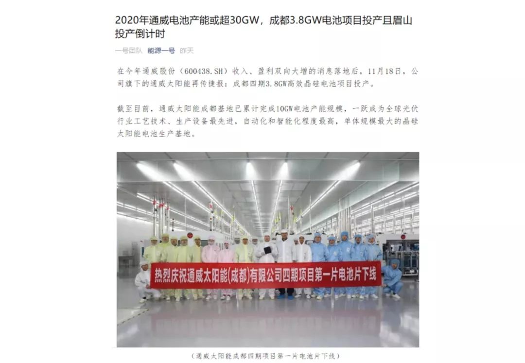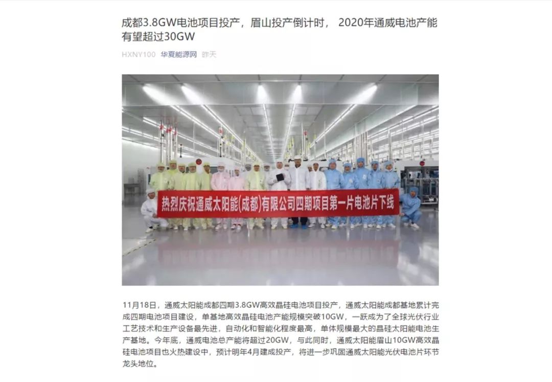 華夏能源網以《成都3.8GW電池項目投產,眉山投產倒計時,2020年通威電池產能有望超過30GW》為題,深度解讀通威太陽能在電池片環節取得傲人成績背后的秘訣,詳細報道了四期項目的整體情況。報道指出,無論行業如何變化,通威太陽能苦練內功、內抓管理降成本、外拓市場增效益,保持了持續盈利、良性發展的健康發展。