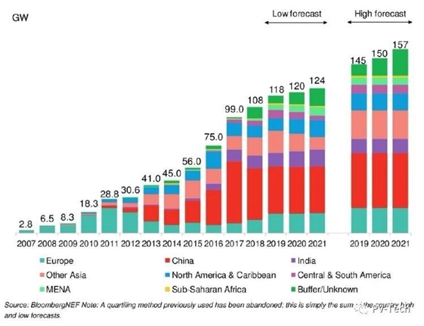 根據彭博新能源財經對2019年二季度的預測(低預測值),預計至2021年,光伏年裝機量不會高于124GW,三年間的平均年裝機量為121GW。