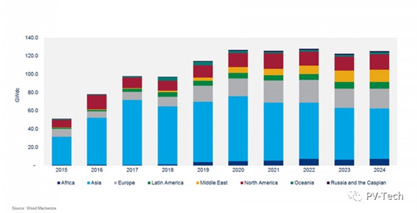 Wood Mackenzie的最新預測稱,2019年全球太陽能市場將達到114.5GW,較上年增長18%。至2024年,預計光伏年裝機量將達到120GW-125GW。