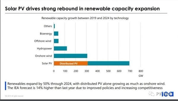 根據IEA的五年預測報告,從2019年至2024年,預計太陽能光伏行業會新增近700GW項目。根據IEA的新聞稿,在1200GW新能源項目總量中,光伏占比為60%。