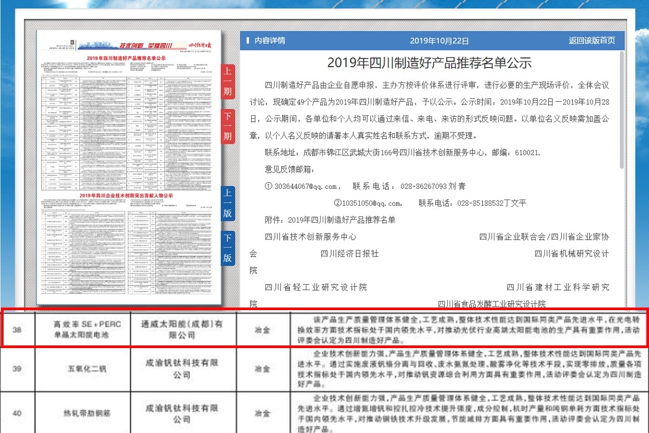 10月22日,四川省技術創新服務中心發布了《2019年四川企業技術創新發展能力100強入圍名單公示》和《2019年四川制造好產品推薦名單公示》,通威太陽能成都公司喜獲兩項殊榮。