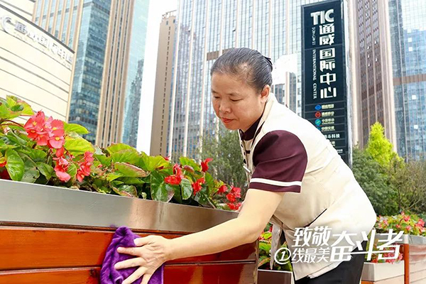 47歲的李茂群每天上班要騎20多分鐘自行車,入職通宇物業4年半以來,風雨無阻。她一般早上7點之前就到崗,第一件事就是做大樓外圍的清掃工作。