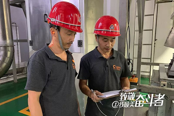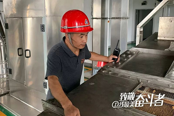 烘干機、冷卻器、振動篩、真空噴涂……在生產機器震耳欲聾的轟鳴聲中,我們跟隨劉中倫的腳步,檢查了產線上的20多個裝置設備和生產節點。在每一處節點,他都進行了耐心細致地檢查,并通過對講機聯系自己的同事,描述和分析自己看到的問題。