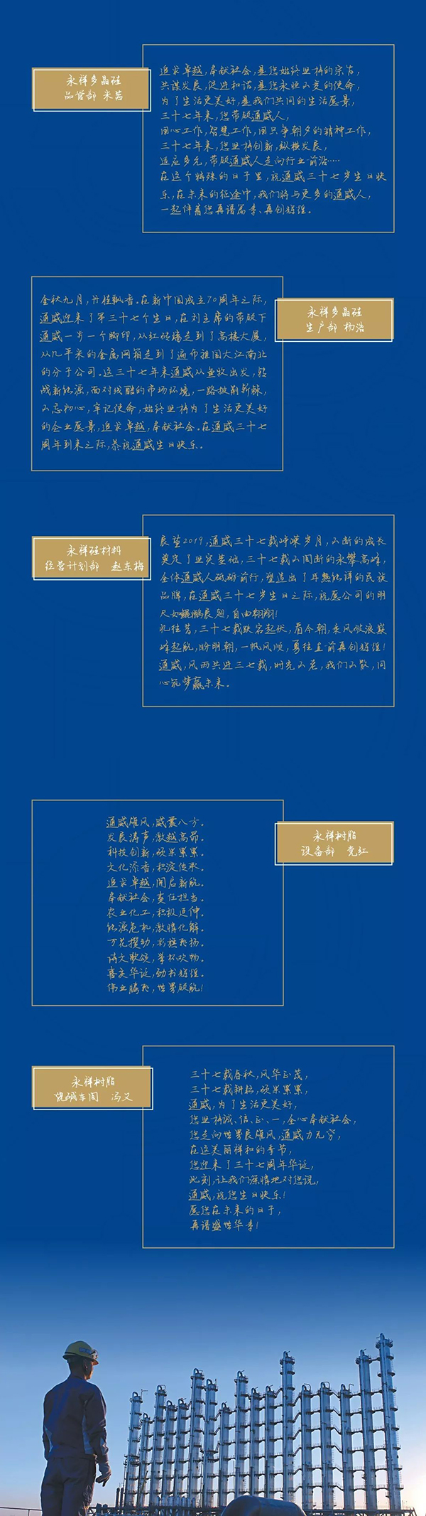 在祖國70年華誕之際,在通威37年生辰之際,通威集團各體系員工,緊密團結在一起,“不忘初心 與國同夢”,共同獻上最真摯的祝福,獻上最熱切的寄語,祝愿親愛的通威大展宏圖,祝愿偉大的祖國繁榮富強!