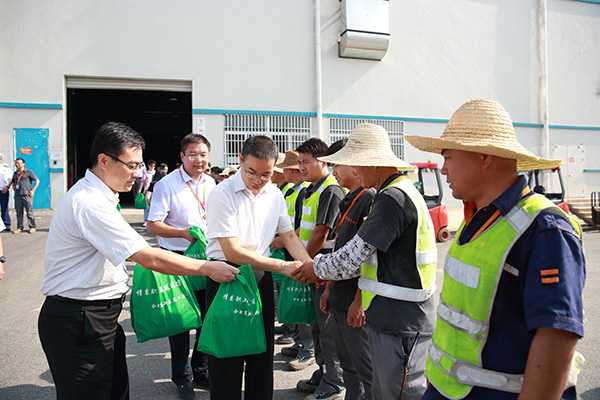 慰問(wèn)活動(dòng)中,宋道軍主任與每一位戶外工作員工親切交談并握手,親自將慰問(wèn)品送到他們手中,了解戶外工作員工的身體情況和工作情況,并致以深深的敬意,感謝他們?yōu)楣靖冻龅男燎诤顾瑸樯鐣?huì)帶來(lái)的奮斗精神。“高溫天氣工作確實(shí)挺辛苦的,但有領(lǐng)導(dǎo)們的關(guān)懷和慰問(wèn),再難再艱辛我們也一定能克服”,計(jì)劃部一位叉車作業(yè)員感激地說(shuō)道。