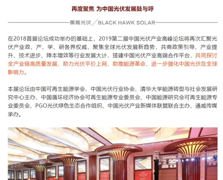 當前,減少煤電消耗、改善空氣質量,建立良性的生態環境是我國堅持綠色發展的大勢所趨,光伏行業的發展,已成為促進中國經濟實現綠色發展、高質量發展的重要助力。借由本屆論壇,在國家主管部門、權威專家學者、行業領軍企業及廣大媒體的共同推動與不斷探索下,通過產業政策優化,技術創新升級,發電成本下降、效率提升,將有效推動我國光伏產業的繁榮與進步,早日實現能源革命、平價上網,踐行青山綠水、藍天白云的中國夢!