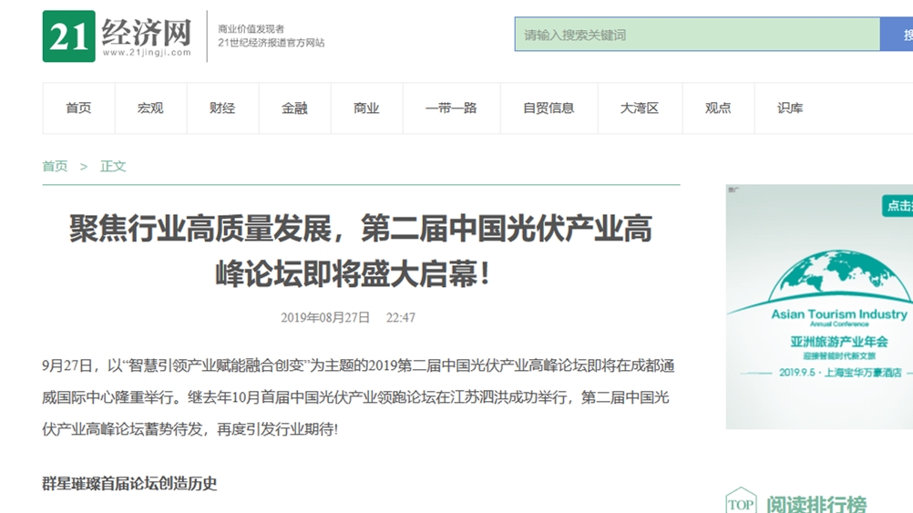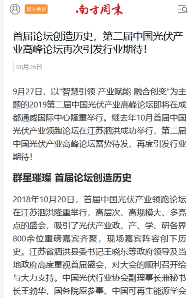 近兩日,光伏行業被一條重磅新聞點燃:9月27日,以“智慧引領 產業賦能 融合創變”為主題的2019第二屆中國光伏產業高峰論壇即將在成都通威國際中心隆重舉行。這是繼去年10月首屆中國光伏產業領跑論壇在江蘇泗洪成功舉行后,再度舉辦。消息一經公布,立即引發行業和媒體關注。包括南方周末、時代周報、長江商報等主流媒體,21世紀經濟報道、中國經營報、金融投資報等財經媒體,索比光伏網、黑鷹光伏、PV News、光伏新聞等行業媒體,數十家媒體對第二屆中國光伏產業高峰論壇即將召開的消息進行了聚焦報道。