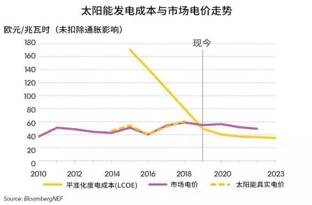 圖中黃色實線為LCOE(平準化度電成本,Levelized Cost of Energy),是國際上通用的評價度電成本的指標。紅色實線為市場電力價格。
