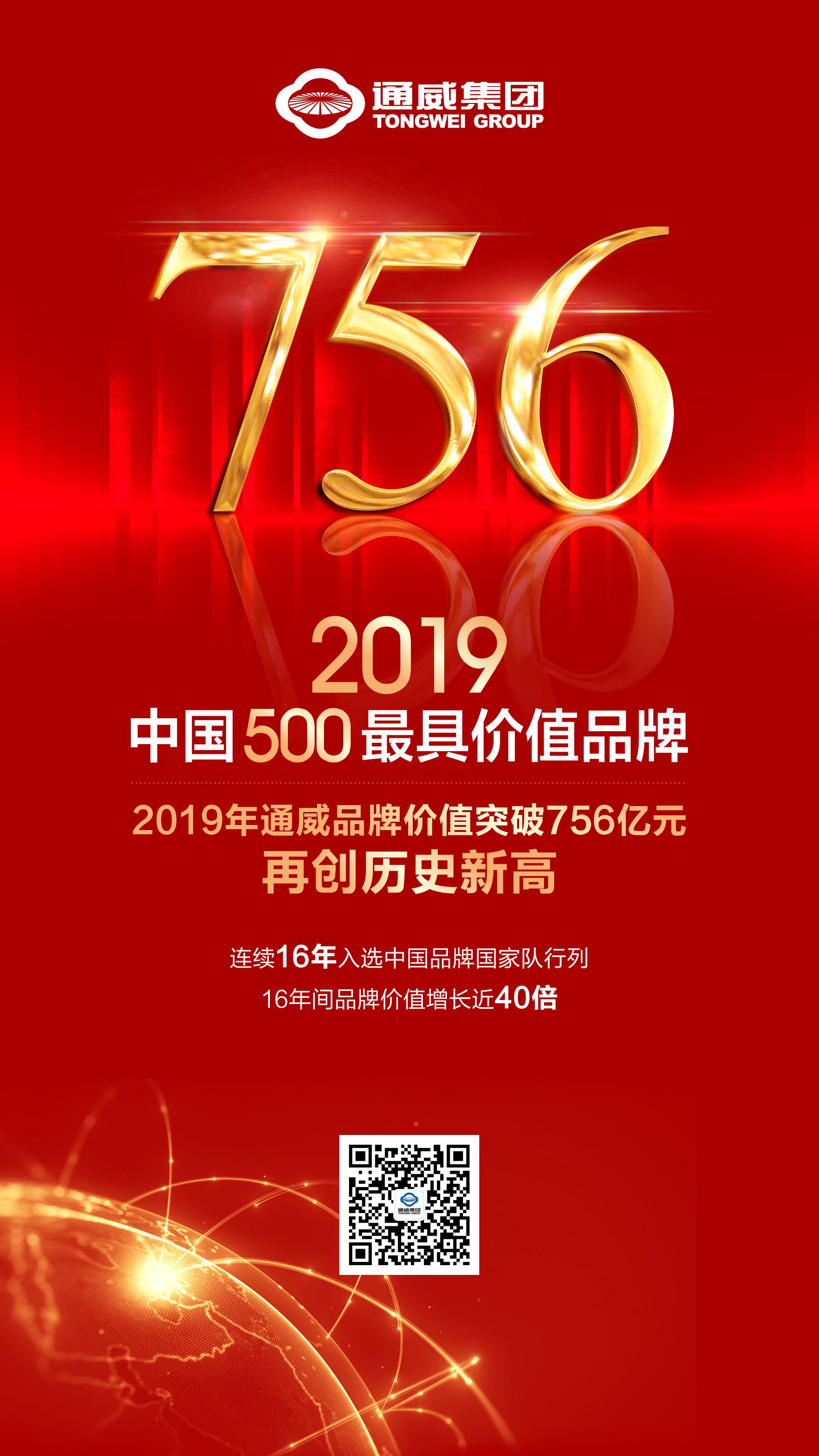 6月26日,由世界品牌實驗室、《世界企業家》等共同主辦的2019年第十六屆世界品牌大會暨2019年(第十六屆)中國500最具價值品牌發布會在京隆重舉行。繼去年以550.29億元突破550億元大關之后,今年通威集團以756.15億元再創品牌價值新高,連續第16年入選中國品牌國家隊行列!從2004年的19億元,到2019年突破756億元,通威品牌價值在短短16年里增長了近40倍,展示了全國乃至全球綠色農業和綠色能源龍頭企業和領軍品牌的雄厚實力。