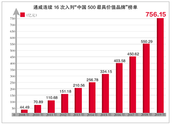 2004年,通威品牌價值僅為19億元,到2011年已邁上了百億臺階,2012年一舉突破150億大關,2015年實現品牌價值334.15億元,2017年、2018年再接再厲,相繼突破450億元、550億大關,2019年則成功突破756億,推動通威品牌建設實現歷史性跨越。品牌價值增長近40倍,這種追趕型、跨越式強勁增勢,正成為全球企業品牌發展中一道亮麗風景,受到社會各界的高度關注。