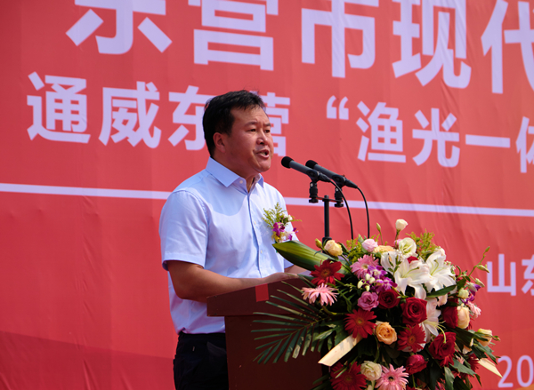 6月18日,通威東營“漁光一體”生態園開工儀式在東營市現代畜牧業示范區隆重舉行。東營市政府副市長韓利學,東營市發展改革委員會副主任古金釗,東營市自然資源局局長陳蔭魯,東營市海洋發展和漁業局副局長張寶民,東營市投資促進局黨組書記李慧芬,勝利石油管理局有限公司新能源開發中心主任劉樹亮,東營市市現代畜牧業示范區黨工委書記、管委會主任茍宏水,中國漁業協會會長、農業農村部漁業局原局長趙興武,通威集團禚玉嬌總裁,通威股份光伏事業部總裁陳星宇,通威股份金融總監邱艾松,通威股份光伏事業部部長張凡,通威股份首席水產專家、享受國務院津貼專家吳宗文,通威新能源執行總經理冷剛等領導出席儀式。東營市相關部門主要負責人,東營市部分企業代表及通威東營“漁光一體”生態園區項目建設者共計200余人共同見證。