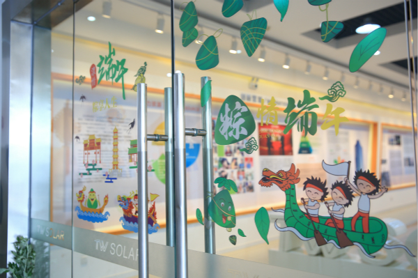 端午節的相關裝扮也閃亮登場,公司行政樓門口、車間辦公室、宿舍等區域都被裝點上了菖蒲、艾草,獨特的端午元素被帶進了現代化廠區,端午節主題噴繪、宣傳欄海報、線上公眾號推送也一齊上陣,營造了濃厚的傳統節日氛圍。