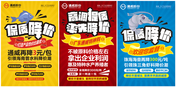 目前普水料四度主動降價,已為終端養殖戶節省約0.4元/斤的斤魚養殖成本;同時,所有普水料產品工藝提升,80%產品的蛋白、賴氨酸等指標提升;由于特種水產原料成本居高不下,在3月初首次降價后所有廠家均按兵不動的情況下,通威率先喊出泥鰍料降價300元/噸,成為市場降價幅度最大的產品;隨后,在珠江三角洲地區擁有蝦料絕對產品力口碑優勢的通威當仁不讓,珠海海壹宣布3款蝦料降價,再次引發行業強烈關注!