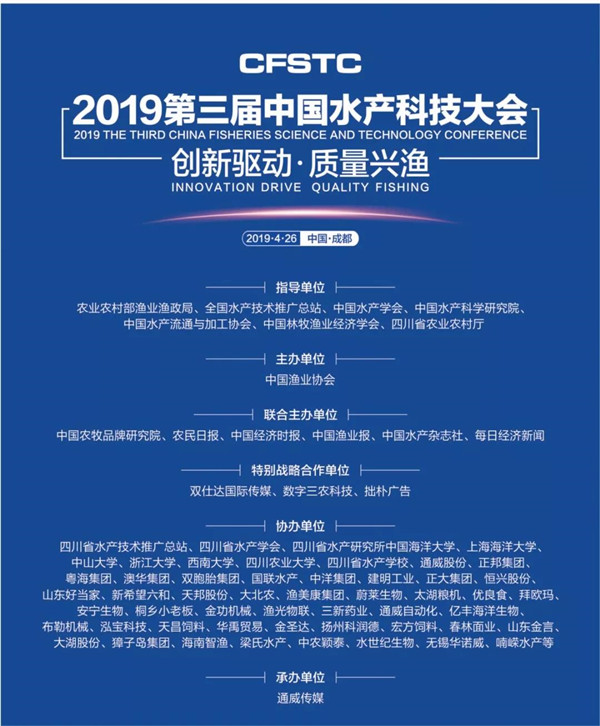 近年來,在環保風暴、食品安全、全球競爭與貿易戰爭的合力下,水產產業鏈各環節均受到不同程度的影響,水產行業面臨前所未有的挑戰。為解決好水產養殖業綠色發展面臨的突出問題,經國務院批準,農業農村部等10部委聯合印發了《關于加快推進水產養殖業綠色發展的若干意見》。在此行業背景下,全國水產技術推廣總站、中國水產學會、四川省農業農村廳等作為大會指導單位,中國漁業協會作為大會主辦單位,四川省水產技術推廣總站、四川省水產學會、四川省水產研究所等行業主管部門、協會、學會作為大會協辦單位,其組織規格屬行業最高。