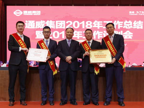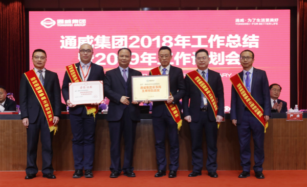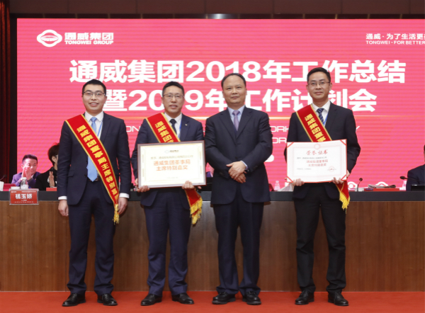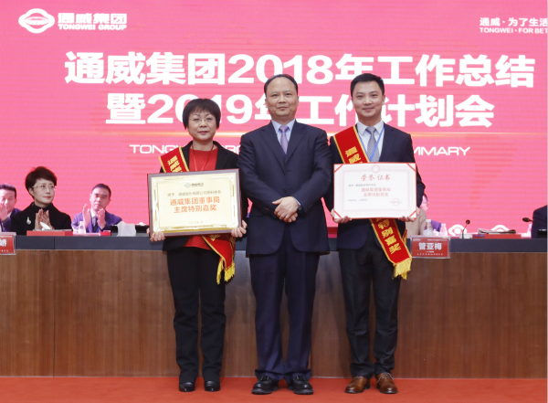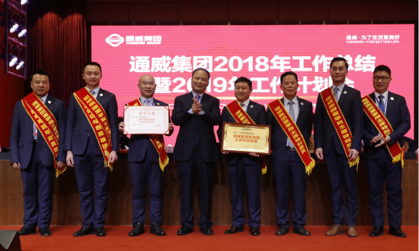 2018年,在貿易紛爭、經濟下行、行業受到沖擊,市場競爭日趨激烈的情況下,全體通威人深入貫徹劉主席“聚勢聚焦、揚長砍短”八字方針,在挑戰與機遇中主動出擊、逆勢而上、直面市場競爭,高效整合資源要素,創新發展,重點突破,精誠團結,取得了舉世矚目的輝煌成績,贏得了行業內外的廣泛尊重,向打造“三個世界級龍頭”的宏偉目標又邁進了一大步!在1月31日舉行的通威集團2018年工作總結暨2019年工作計劃會議上,隆重揭曉了通威集團董事局主席特別嘉獎。
