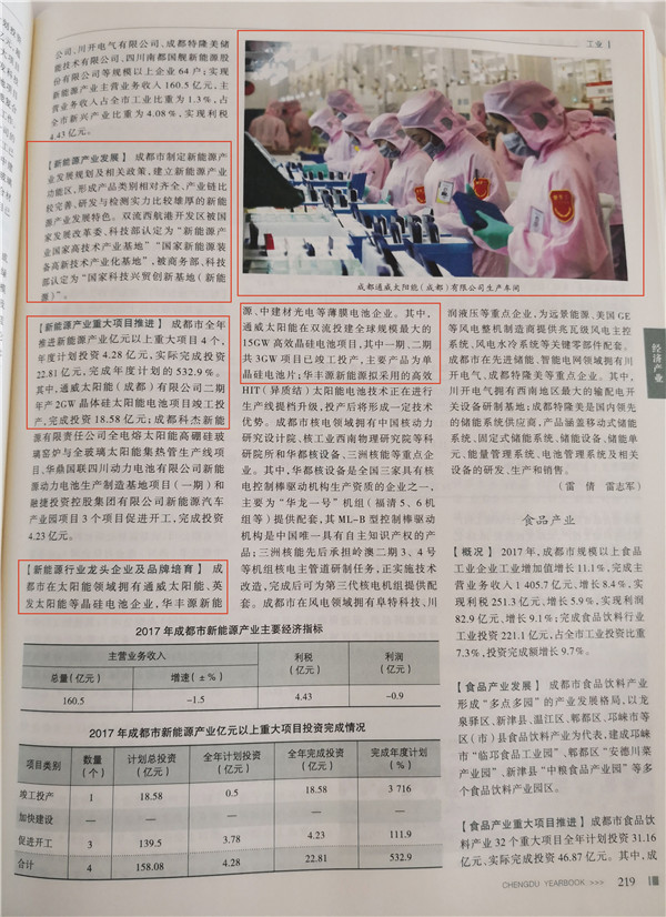 在2018年卷《成都年鑒》中,通威集團(tuán)有限公司被列入2017年度“成都民營企業(yè)100強(qiáng)”和2017年度“成都制造業(yè)100強(qiáng)”。通威太陽能成都公司作為成都市新能源領(lǐng)域的行業(yè)龍頭企業(yè)在年鑒中被多次重點(diǎn)提及。年鑒中詳細(xì)介紹了通威太陽能項(xiàng)目進(jìn)度、產(chǎn)能規(guī)模等情況,并以大畫幅刊登公司智能制造車間內(nèi)生產(chǎn)畫面。
