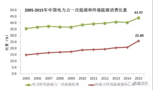 2005-2015年中國電力占一次能源和終端能源消費(fèi)比重