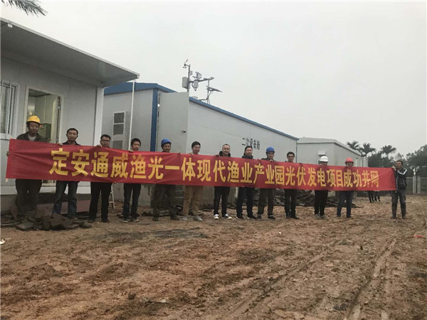 通威海南定安“漁光一體”項目位于定安縣定城鎮平和村,項目規模20MWp,占地面積360畝,從開工到并網只用了37天。外線長度7.1公里,基礎開挖過程中挖到花崗巖及火山巖,對基礎開挖構成很大困難,對于施工難度較大的基礎用大型破碎機開挖,連夜開挖困難,全力拼搶,僅用35天接通線路。光伏區支架、組件、箱變到貨較晚,面對第二天就要投運前電力質監的情況,項目安排工人連夜加班,連夜吊裝箱變、敷設電纜,順利通過質檢站對光伏區的質檢。在手續辦理方面,項目得到了海南電網公司和定安供電局全力支持,兩次安排人員冒雨進行驗收,最終實現成功并網。