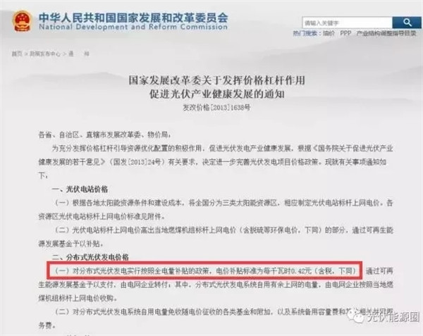 2013年8月30日,國(guó)家發(fā)展改革委發(fā)布《關(guān)于發(fā)揮價(jià)格杠桿作用促進(jìn)光伏產(chǎn)業(yè)健康發(fā)展的通知》,給予戶用光伏0.42元度電補(bǔ)貼。