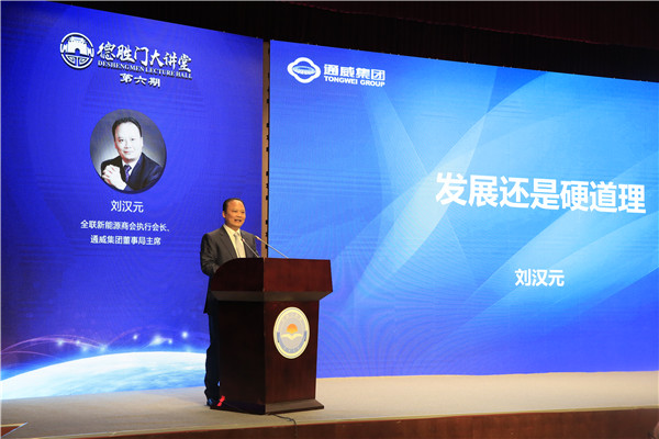 9月28日,由全國工商聯主辦,全聯新能源商會、全國工商聯人才交流服務中心共同承辦,主題為“新能源,新動能”的第六期“德勝門大講堂”在京舉行。中央統戰部副部長、全國工商聯黨組書記、常務副主席徐樂江,國家發展改革委能源研究所副所長王仲穎,全國工商聯研究部主任林澤炎,全國工商聯會員部副部長張新武,全國工商聯聯絡部副部長葛敏等領導、行業專家以及隆基股份董事長鐘寶申、首航節能常務副總經理畢成業等新能源領域具有重要影響力的企業家,圍繞“新能源、綠色發展與多能互補”等熱點話題展開探討。十一屆全國政協常委、全國人大代表、通威集團董事局劉漢元主席應邀出席,并作 “發展還是硬道理”的精彩演講。