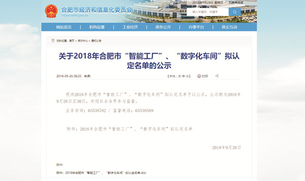 本次名列公示榜單的還有聯(lián)寶(合肥)電子科技有限公司、合肥京東方視訊科技有限公司等16家“智能工廠”和175家 “數(shù)字化車間”。公示期為2018年9月26日至30日。